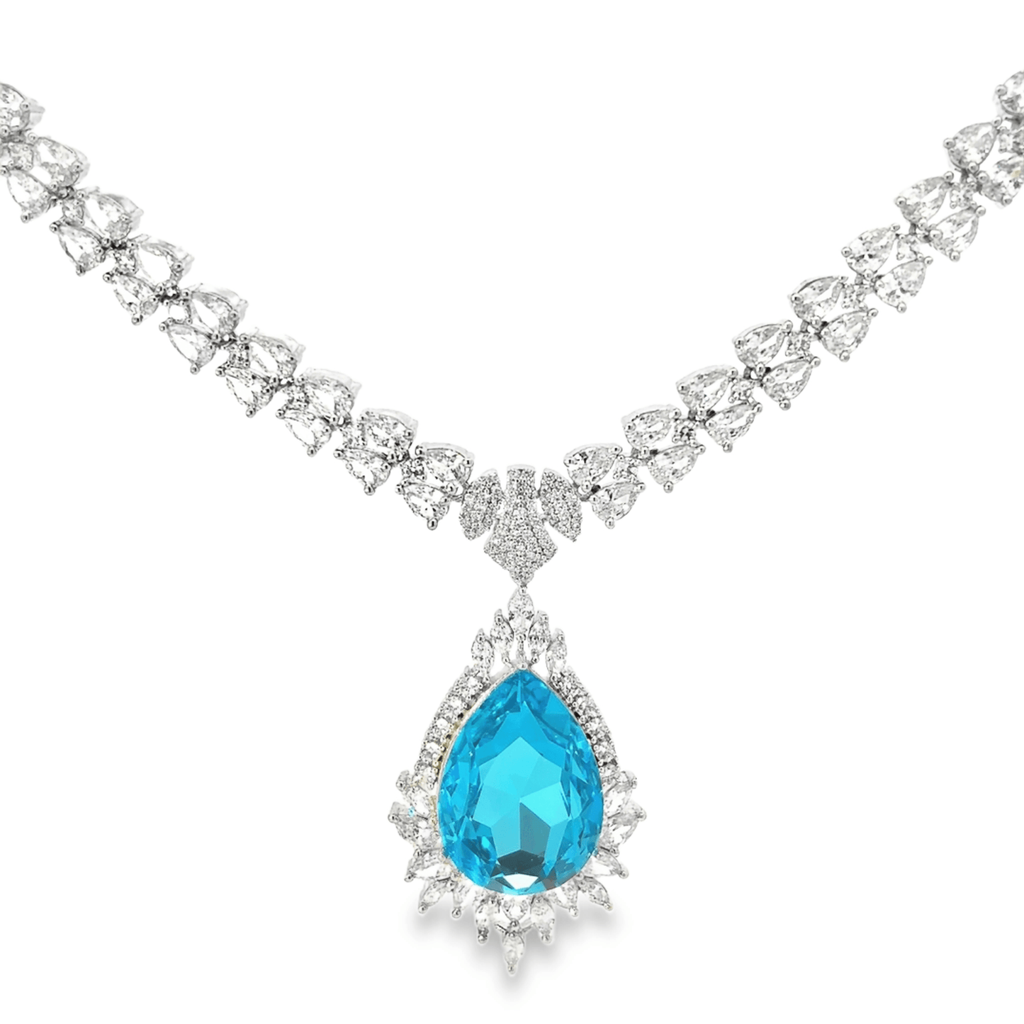 This stunning necklace features a captivating blue Sehrova crystal pendant, elegantly suspended from a delicate chain adorned with sparkling accents. The intricate design showcases a blend of sophistication and glamour, making it the perfect accessory for any formal occasion.
